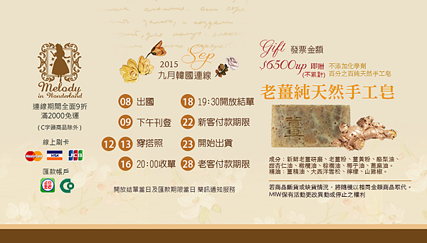 ▼ 請看9月韓國連線排程表,這次的滿額禮是看起來讓人暖上心頭的老薑皂唷