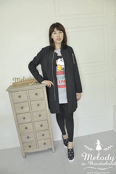這款簡約外套搭上裡面有點呆呆的露西,有點俏皮的感覺,外套的材質有點防潑水的效果,厚度也還蠻適合秋天的!