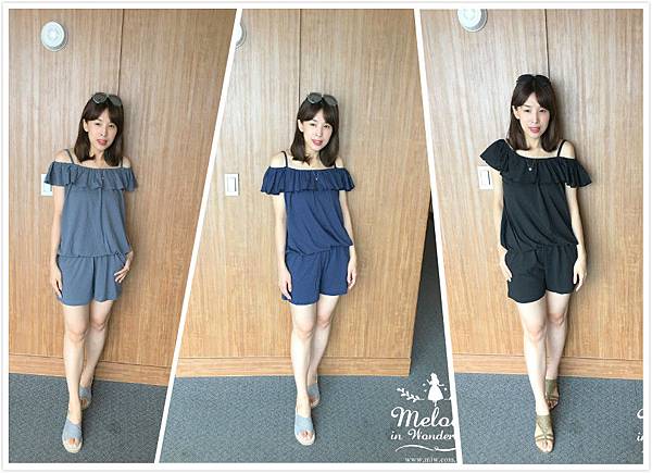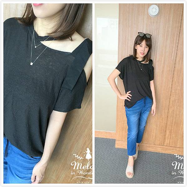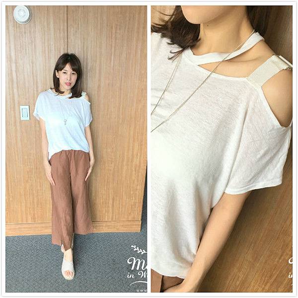 上衣是今年很夯的一字領,一般可以向灰色及藍色穿搭照那樣很自然甜美的拉成一字領穿著