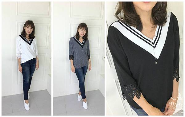 1609-133 率性V領線紋上衣(5色) 白色款 https://goo.gl/pZi0hE