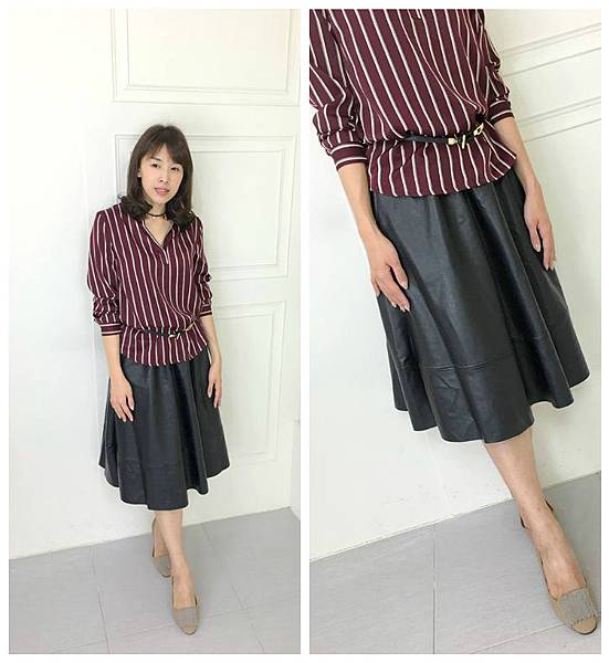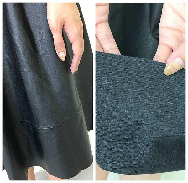 這款皮裙的皮質算是介於亮片和霧面之間,皮紋很細緻,很接近真皮的氣質~
