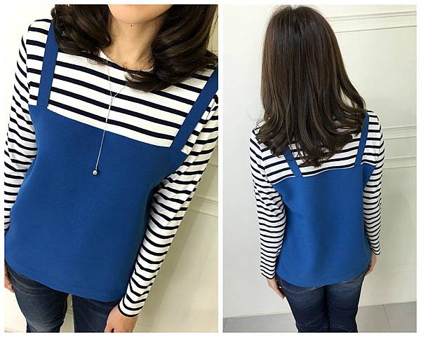 ▶▶▶ 1609-161 假兩件式條紋背心上衣(4色) 深藍款
