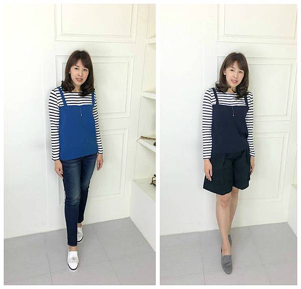 很多捧友都會恐懼穿上條紋的擴張感,那幫您外加上一個背心,不就完全免了這個疑慮~