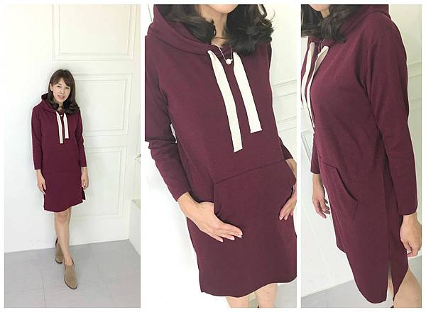 ▶▶▶ 1609-180 休閒抽繩連帽洋裝(4色) 黑色/酒紅款