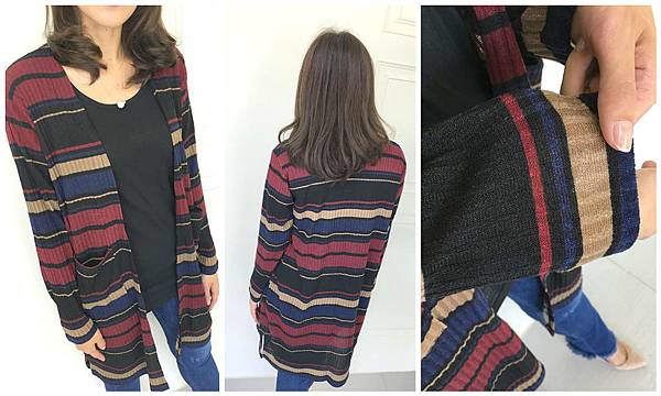 ▶▶▶ 1609-176 質感條紋拼色長版罩衫(3色) 酒紅款