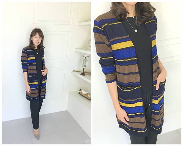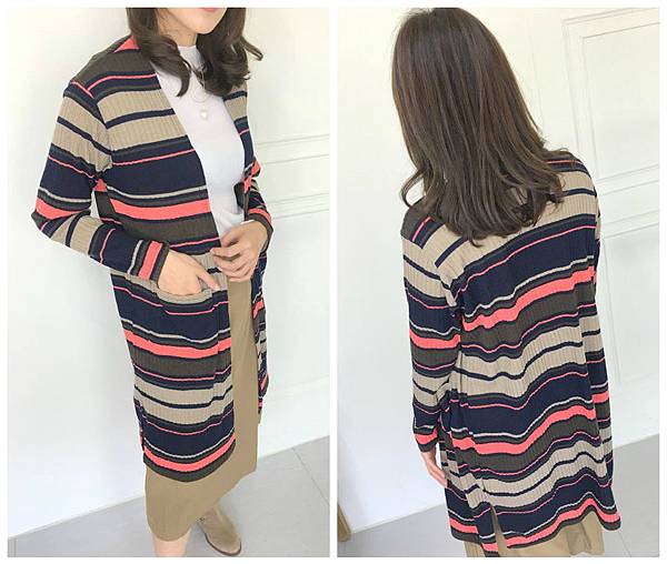 ▶▶▶ 1609-176 質感條紋拼色長版罩衫(3色) 褐色款