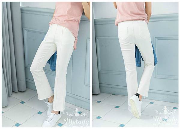 再加上不收邊褲管,讓整個視覺往下帶,延伸腿部視覺感!