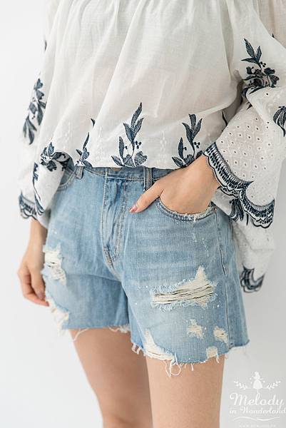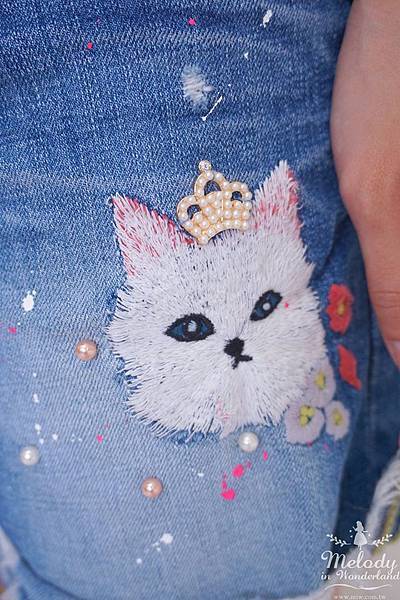 1705-131 貓咪刺繡潑漆牛仔短褲