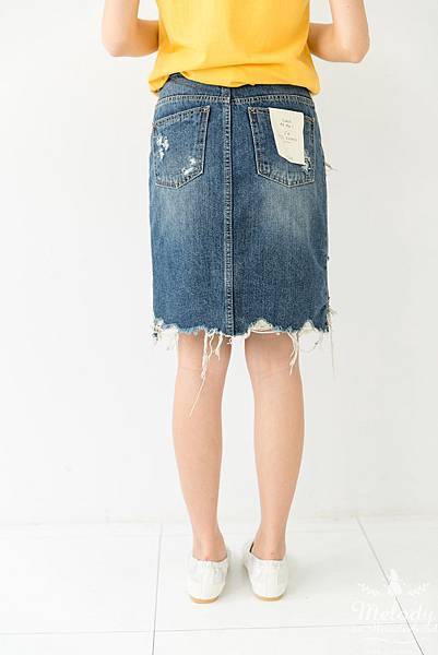 1705-136 不規則鬚邊下擺淺刷色破損牛仔裙