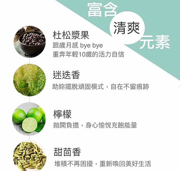 成分有:杜松漿果、葡萄柚、甜茴香、綠檸檬、迷迭香、絲柏、