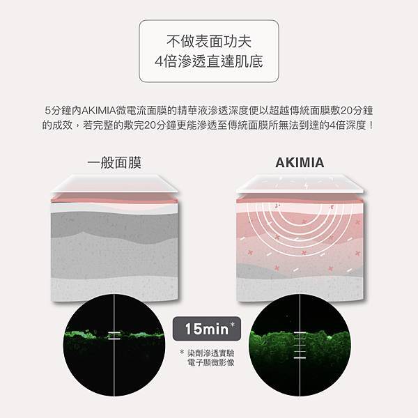 但AKIMIA微電流面膜,5分鐘內就能將精華液滲透深度超越傳統面膜敷20分鐘的成效,