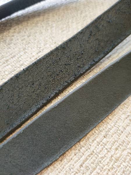 從背帶近拍(背面),是沒有特別修飾過的真皮天然紋路