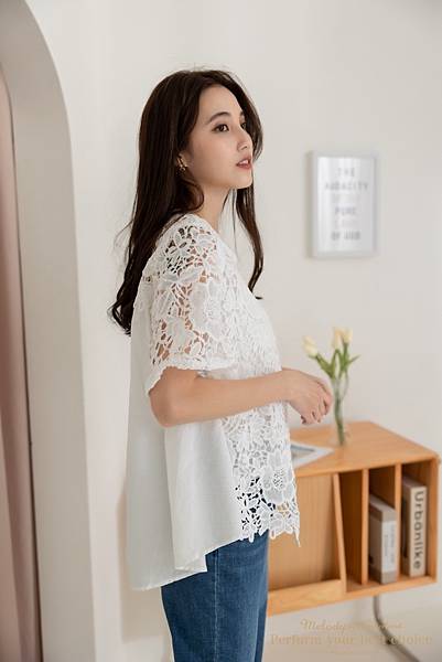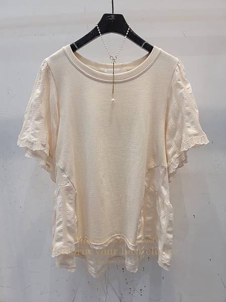 這邊幫春妞搭配的上衣>2204-045 微皺感布蕾絲拼接內縮造型上衣(2色)