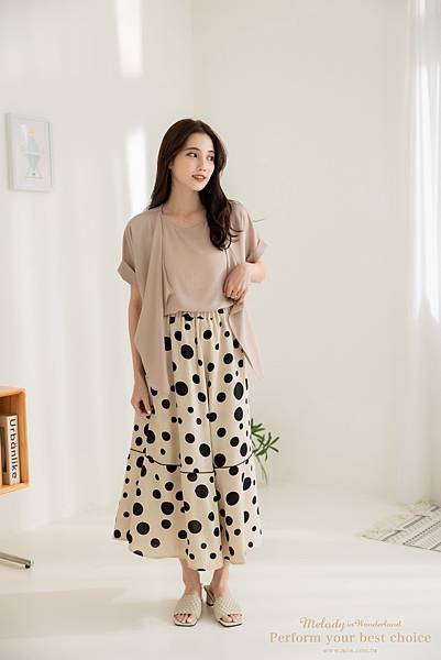 卡其色拼接馬甲造型,布料質感好,摺度漂亮