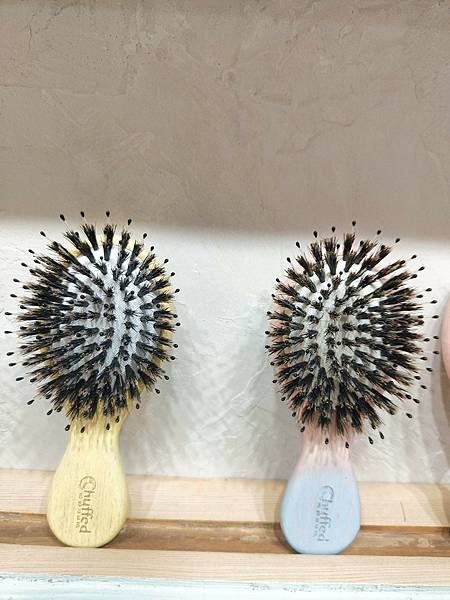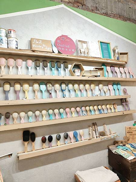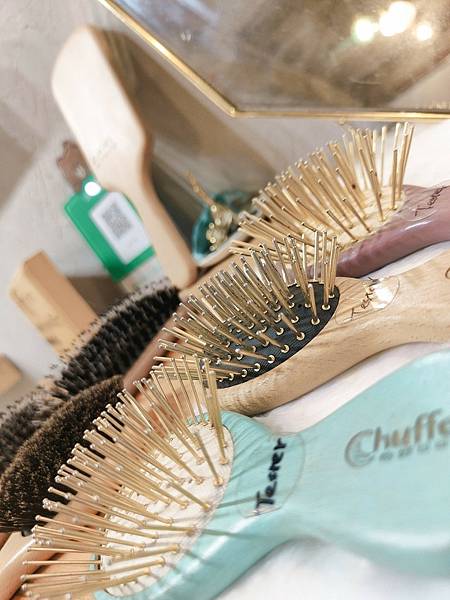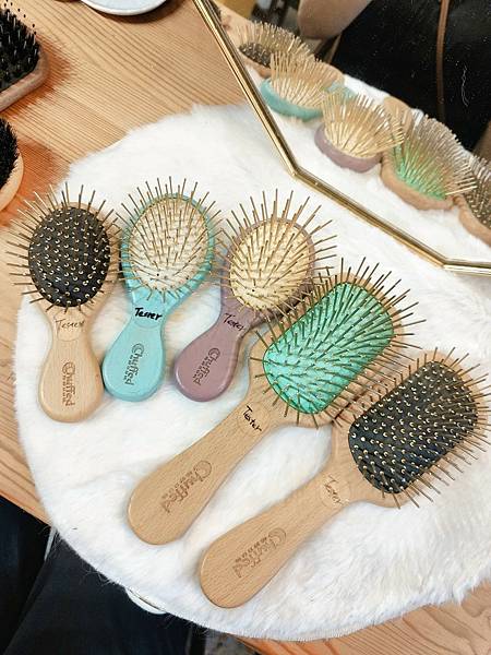 陳列架旁很復古的梳妝台上擺放著各式試用梳,